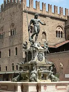 Laureti was born in Palermo, Sicily. After his first master's death in 1547, he settled in Bologna, introducing illusionistic perspective paintings on ceilings to the city, notably an Alexander the Great ceiling with a painted architectural setting in Palazzo Vizzani.[3] He painted a Transportation of the Body of Saint Augustine for the church of San Giacomo Maggiore in Bologna. The Mannerist structural elements of the marble and bronze Fountain of Neptune in Bologna, which is surmounted by Giambologna's Neptune, completed in 1566, were based on a 1563 drawing by Laureti. This commission from Pope Pius IV is undoubtedly Laureti's most familiar public work (illustration, left below).