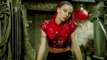 The music video for "Too Much" was directed by Howard Greenhalgh and filmed on 10 November 1997 in a studio located in London.[48][49] The video features each Spice Girl in their own individual scene, inspired by their own film fantasies.[50] Melanie Brown is shown singing on top of a tank strapped with ammunition in an industrial post-apocalyptic war scene in a segment based on the film Mad Max Beyond Thunderdome (1985). Emma Bunton is shown in a bedroom dressed in white pyjamas while objects float around her on their own; her scene is based on Poltergeist (1982). Melanie Chisholm is shown in a Chinatown, dressed in a red cheongsam and black pants with her hair in a long ponytail with red streaks; her scene is based upon Year of the Dragon (1985). Geri Halliwell is featured in a black-and-white scene based on Rita Hayworth's performance in Gilda (1946). She is shown performing on a smoky stage in a long, white sequined gown with a group of sailors dancing around her. Victoria Beckham is shown in a missile silo next to a smoking rocket, clad in a black catsuit and with a long ponytail; she is portraying Catwoman from Batman Returns (1992).[49][50]