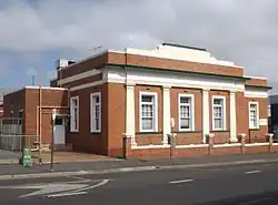 In the original section, offices are located along the eastern side of the building. The walls in the offices have been rendered and each have a timber dado rail and picture rail. Most of the offices have a dentilled plaster cornice, however, one, at the southern end of the building has only a moulded plaster cornice, without dentils. The original strong room is still extant and is located on the southern side of the building. An office on the western side of the building, forming part of the original section, has been refurbished, including the lowering of the ceiling. A panelled, timber door, with sidelights, located in the north-western corner of the office, opens to the main office area. Toilets and kitchen facilities, with recent renovations, are located on the southern side of the building.[1]