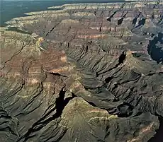 Topaz Canyon is a linear, narrow canyon in the western Grand Canyon, below the South Rim. It lies in a region of four canyons, and a fifth smaller canyon, all trending mostly northeasterly towards the west-flowing Colorado River, in western Grand Canyon National Park. The name of Topaz Canyon was named by the Board of Geographical Names for precious stones of the region.[3] Topaz Canyon is the southeast border of the linear, and major, forested-landform, Diana Temple; (Slate Canyon is Diana Temple’s northwest border).