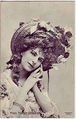 She also joined the company of George Edwardes where, in the early 1890s, she appeared in the burlesques Cinder Ellen up too Late and Don Juan.[7] Also at the Gaiety, Edwards cast her in In Town (1892), and, in 1894, still aged 16, she danced in A Gaiety Girl at Daly's Theatre and then played the role of Violet Deveney in Edwardes's hit Edwardian musical comedy, The Shop Girl, at the Gaiety.[4][8] At the invitation of Harris, Sinden then danced in grand operas at Covent Garden until his death in 1896.[4][5] In 1897, she was principal dancer in The Yashmak at Shaftesbury Theatre[4] and was also dancing at the Avenue Theatre opposite Lottie Venne.[9] In 1899, with Edwardes's company at Daly's Theatre, she played Trixie in San Toy, in which she "contributes a graceful dance".[10] She also performed in music hall and pantomime (usually as "principal girl") during these years, including at the Britannia Theatre, the Metropole Theatre in Camberwell, and elsewhere.[4][11][12]