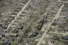 During the winter months of the year, tornadoes have been known to hit the Southern United States and Southeastern United States the most, but have hit other areas as well.[8] One notable recent example of a winter tornado outbreak was the 2008 Super Tuesday tornado outbreak on February 5 and February 6, 2008. 87 tornadoes occurred over the course of the outbreak. The storm system produced several destructive tornadoes in heavily populated areas, most notably in the Memphis metropolitan area, in Jackson, Tennessee, and the northeastern end of the Nashville metropolitan area. At least 57 people were killed across four states and 18 counties, with hundreds of others injured.[9] The outbreak was the deadliest of the modern NEXRAD doppler radar era, until the 2011 Super Outbreak killed over 348 people (324 of which were tornado-related). It was the deadliest single outbreak since the May 31, 1985 outbreak, which killed 76 across Ohio and Pennsylvania, as well claiming 12 victims in Ontario, Canada. It was also the deadliest outbreak in both Tennessee and Kentucky since the 1974 Super Outbreak.[10]