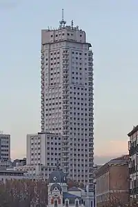 It is situated on the Plaza de España, being a symbolic building for the plaza and the city. It holds offices and apartments. It was the highest office building in Western Europe until 1967, when it was surpassed by the 150-metre high South Tower in Brussels. The Tower appeared in numerous Spanish movies released in the 1960s.