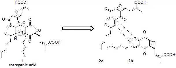 - ↑ Mehta G, Pan SC (October 2004). "Total synthesis of the novel, biologically active epoxyquinone dimer (+/-)-torreyanic acid: a biomimetic approach". Organic Letters. 6 (22): 3985–8. doi:10.1021/ol0483551. PMID 15496080.