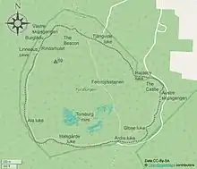Torsburgen is the third largest fortified hill-fort in Scandinavia,[3] with an area of 112.5 ha (1.125 km2; 0.434 sq mi). It was most likely created during the Late Roman Iron Age (200 - 400 AD), the walls surrounding the area of the hillfort were made of dry stone, rubble from boulders, limestone, and a raised beach. While other hillforts in Sweden are described as vitrified, meaning the remains were turned to a glasslike substance by exposure to heat, Torburgen is a calcined hillfort, the remains of this site were reduced by roasting, leaving a different sort of rubble behind– it is sandy, almost black and strongly magnetic. In the latter case, the residue was a clayey to silty, yellowish brownish material. It is suggested that the walls of this fort were destroyed by fire from enemies.[10]