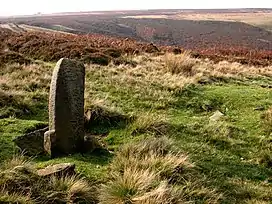 There are three Bronze Age cairnfields along Brown Edge ridge which are protected Scheduled Monuments.[8][9][10] An excavation in 1963 of the site of a 7m wide ring cairn discovered cremation remains, urns, a pygmy cup and a hearth. The artefacts are on display in Weston Park Museum, Sheffield.[11] In 1960, following fires on the moor, a Bronze Age shale-working floor was discovered at Flask Edge with shale fragments of bracelets and rings.[12]