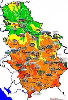 A map featuring some of the best-known tourist attractions in Serbia