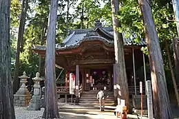 The temple was patronized in the Sengoku period by Imagawa Yoshimoto, Oda Nobunaga, Toyotomi Hideyoshi and Tokugawa Ieyasu, and by pilgrims from the merchant classes in the Edo period through the modern period.[9] Other notable devotees of Toyokawa Dakiniten include the Edo period magistrate and daimyō Ōoka Tadasuke, whose residence in Akasaka, Tokyo eventually became Toyokawa Inari's Tokyo branch temple, the painter Watanabe Kazan, and Prince Arisugawa Taruhito, who donated a framed sign (扁額, hengaku) in his own calligraphy of the words "Toyokawa Temple" (kyūjitai: 豐川, Toyokawa-kaku; shinjitai: 豊川閣).[9]
