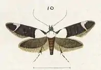 Male, female.— 14-17 mm. Head, palpi, and antennae dark fuscous. Thorax white, anterior margin dark fuscous. Abdomen fuscous. Legs dark fuscous, apex of tarsal joints obscurely pale. Forewings elongate, costa arched towards base and apex, rest nearly straight, apex round-pointed, hindmargin very obliquely rounded ; dark fuscous ; a large white basal patch, slightly ochreous-tinged, outer edge slightly irregular, extending from 14 of costa to before middle of inner margin ; a small elongate blackish spot on base of costa ; two large spots of raised ochreous-brown scales, partially black-margined, in disc before middle, and two smaller ones beyond middle ; a small somewhat triangular inwardly oblique white spot on costa at 45 , emitting from its apex a slender white outwards-angulated line to hindmargin above anal angle, anteriorly blackish-margined : cilia fiasco as-grey, with an obscure darker line. Hindwings fuscous-grey, darker towards apex ; cilia fuscous-grey, with an obscure darker line.[3]