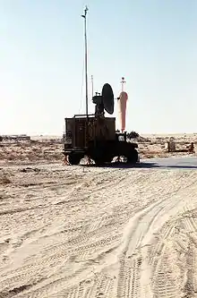 An M998 High-Mobility Multipurpose Wheeled Vehicle (HMMWV) carrying a radar and tracking system shelter sits parked at an airfield during Operation Desert Shield. The shelter is used by the Marines of the 3rd Remotely Piloted Vehicle (RPV) Platoon to track their Pioneer RPVs during flight.