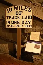 The ten-mile rail segment laid in 1869 (and the Promontory Golden Spike site) was bypassed in 1903 with the completion of the Lucin Cutoff,[22] although service continued for several years on the original route, which the Southern Pacific called its Promontory Branch.[23][24] The abandoned rails were eventually taken up for scrap and reuse in 1942.[25][26] At the Golden Spike National Historical Park, the West Auto Tour is a 7-mile (11 km) route that takes tourists to a replica of the sign erected by the CP at the site to commemorate the April 28 record.[27] The original sign is thought to be in the Utah State Capitol building in Salt Lake City; a replacement sign that may have stood at the site is on display at the visitor's center in Promontory, and a replica is displayed at the California State Railroad Museum in Sacramento.