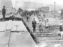 The next day, work began at daybreak. One railcar, fully loaded with eight pairs of 30-foot (9.1 m) rails, spikes, and other supplies, was pulled up to the end of the track by teams of horses; when it met an empty car returning to the supply base, the empty car was tipped on its side to allow the loaded car to pass.[14] As the loaded car reached the end of the line, one pair of rails was pulled down and laid over the ties by a team of four rail handlers, then the car was advanced over the loose rails while another team of spikers started spikes to secure the rails. Additional teams finished the spiking and buried the ends of the ties.[14]
