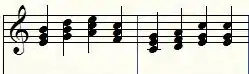 Arom Simha proceeds to note "We have already remarked that specific vertical combinations in each formula act as temporal reference points by virtue of their regular repetition at a given position in the periodic cycle. These combinations are the points at which several superposed melodic lines meet. They are usually based on octaves, fifths, and fourths, precisely the intervals which make up sections 1–4 of Chailley's resonance table (i960: 35), and this is certainly no accident. We may therefore assume that they take on a structural function." These vertical combinations that constitute reference points are chords that, together, form a chord progression. This is similar to the concepts of chords and progressions in cyclical forms in Jazz, Blues and other musics of the African diaspora.