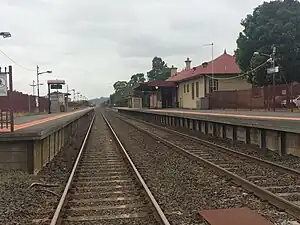 On 2 July 1987, electrification between Warragul and Traralgon ceased.[1] In 1996, a footbridge at the station, which was located at the up end, was closed, and replaced with a pedestrian crossing.[2] In 1997, boom barriers were provided at the Ashby Street level crossing.[2]