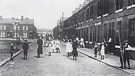 In 1898, a large plot of land was sold to Edmund Nuttall & Co. for the construction of 1,200 houses. The houses were never built, but the land later became the site of Trafford Park Village, known locally as The Village.[75] The announced arrival of the Westinghouse factory acted a spur to development, and in 1899, Trafford Park Dwellings Ltd was formed, with the aim of providing housing for the anticipated influx of new workers. Nuttall's land was acquired, and by 1903 more than 500 houses had been built, rising to over 700 when the development was completed in 1904. In 1907 it was estimated that the population of the Village was 3,060.[76] The development was laid out in a grid pattern, with the roads numbered instead of being named. Avenues numbered 1 to 4 run north–south, streets numbered 1 to 12 run east–west.