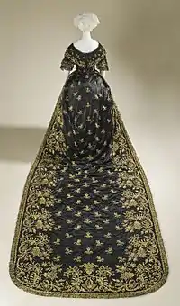 • Court train – Worn for formal court occasions, the court train had to fall in with strict dress codes which differed from court to court. For example, the French court code set in 1804 by Jean-Baptiste Isabey prescribed a four-inch maximum width for embroidered train borders for non-Royal wearers.[1] In Britain it was required to be three yards in length at the minimum.[2]