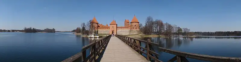 Trakai Island Castle (Lithuanian: Trakų salos pilis; Polish: Zamek w Trokach) is an island castle located in Trakai, Lithuania, on an island in Lake Galvė. The construction of the stone castle was begun in the 14th century by Kęstutis, and around 1409 major works were completed by his son Vytautas the Great, who died in this castle in 1430. Trakai was one of the main centers of the Grand Duchy of Lithuania and the castle held great strategic importance. The castle was rebuilt in the 1950s–1960s by Lithuanian initiative, although it had received resistance from Soviet authorities. The Trakai History Museum was established after the reconstruction.[1]