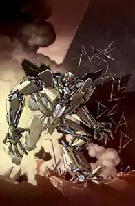 The first issue's "B" cover is modeled after Marvel Comics's The Transformers (USA) #5, where Shockwave stands against "Are All Dead" graffiti.[19]