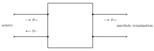 Note that cannot be measured directly in isolation from the reflected wave pressure (in the inlet, away from muffler). One has to resort to impedance tube technology or two-microphone method with modern instrumentation.[1] However at the downstream side of the muffler, in view of the anechoic termination, which ensures .