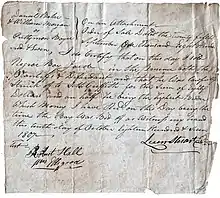 Receipt for $500 payment ($10,300, adjusted for inflation as of 2007) for slave, 1840: "Recd of Judge S. Williams his notes for five hundred Dollars in full payment for a negro man named Ned which negro I warrant to be sound and well and I do bind myself by these presents to forever warrant and defend the right and Title of the said negro to the said Williams his heirs or assigns against the legal claims of all persons whatsoever. Witness my hand and seal this day and year above written. Eliza Wallace [seal]"