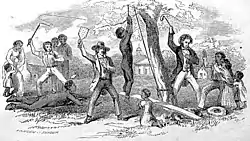 Slaves were punished for a number of reasons: working too slowly, breaking a law (for example, running away), leaving the plantation without permission, insubordination, impudence as defined by the owner or overseer, or for no reason, to underscore a threat or to assert the owner's dominance and masculinity. Myers and Massy describe the practices: "The punishment of deviant slaves was decentralized, based on plantations, and crafted so as not to impede their value as laborers."[21] Whites punished slaves publicly to set an example. A man named Harding describes an incident in which a woman assisted several men in a minor rebellion: "The women he hoisted up by the thumbs, whipp'd and slashed her [sic] with knives before the other slaves till she died."[22] Men and women were sometimes punished differently; according to the 1789 report of the Virginia Committee of the Privy Council, males were often shackled, but women and girls were left free.[22]