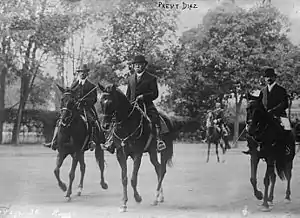 Encouraged by the news of the uprisings, Madero crossed the border back into Mexico in February 1911.[9] He was joined by Pancho Villa and Orozco and in April the army began approaching Ciudad Juárez. Orozco and Villa led the way with 500 men each, while Madero followed up with 1,500 riders.[2] The city was besieged by the end of the month, after Madero's army encountered some resistance in the Chihuahuan countryside.[2] Madero asked the commander of the city's garrison to surrender but the latter refused, hoping that the fortifications he had constructed would allow him to defend the city until reinforcements arrived.[2] Concerned also with the possibility that a direct attack on the town would cause artillery shells to cross the border into the United States, which could provoke an outside intervention, and faced with a series of peace proposals from Díaz, Madero hesitated in attacking the city.[2] He in fact ordered his commanders to lift the siege.[10] Orozco, however disregarded the order and, joined by Villa, attacked.[10] After two days of fighting the city fell to the insurrectionists.[10] Madero intervened personally to spare the life of the city's commander, Gen. Navarro, whom both Orozco and Villa wanted executed for his previous killing of rebel POWs.[10] This, coupled with the fact that both leaders were ignored by Madero in his political appointments, outraged and estranged them from him.[10]