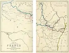 A convention on the military line regulated all matters concerning the temporary occupation of the frontiers of France by a Coalition army of 150,000 men, conforming to Article V of the definitive treaty. The military line to be occupied, would extend along the frontiers which separated the departments of the Pas de Calais, of the North of the Ardennes, of the Meuse, of the Moselle, of the Lower Rhine, and of the Upper Rhine, from the interior of France.[19]
