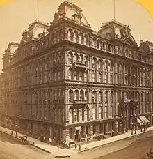 The fourth hotel was designed by John M. Van Osdel, who had designed the previous third hotel. It opened its doors in 1873. It stood six floors.[1] It was constructed James Couch and the estate of his brother Ira Couch, who had himself passed away in 1857.[5][6] The rebuilt hotel remained along with the Palmer House, Grand Pacific Hotel and the Sherman House as a leading hotel after the Great Chicago Fire.[2] It was built in the commercial palazzo architecture style of the day and claimed to be fireproof.[2] James Couch and his son Ira Couch (not to be confused with his late brother of the same name) were the proprietors of the new fourth incarnation of the hotel at its opening.[3] The hotel was one of the city's "big four" post-fire hotels, the other three being the Grand Pacific, Palmer House, and the Sherman House.[16]