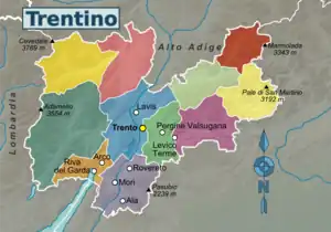 Trentino is the southern part of the Trentino-Alto Adige/Südtirol autonomous region of Italy. Wine is produced in Trentino from several grape varieties, including the native Nosiola, Teroldego, and Marzemino varieties. There are six wine DOCs in Trentino.