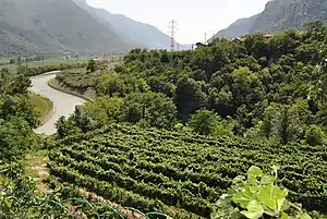 Three grapes are native to this region: one is the white Nosiola and the other two are the red Teroldego Rotaliano and the Marzemino. Trentino D.O.C. Nosiola is made from the eponymous vine grown on the hillsides of Valle dei Laghi and Val di Cembra. Amongst other things, its partially dried grapes are used to make the Trentino D.O.C. Vino Santo from Trentino. In addition to the native grapes, well known international grape varieties such as Chardonnay, Cabernet, Merlot, Moscato, Pinot Nero and Pinot Grigio, as well as Müller-Thurgau, are grown throughout the region.[2]