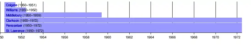 Formed in 1950 by the six colleges, all located in the Northeast, the Tri-State League was named for the three states represented by the schools: Massachusetts with Williams, New York with Clarkson, Colgate, Rensselaer and St. Lawrence and Vermont with Middlebury.[1] In the first season each school played one another once, resulting in five conference games for every team. After the 1950–51 season, however, Colgate left the conference, leaving the league with only five member teams. The following year seven western teams formed the MCHL[2] and while it wasn't a direct rival to the Tri-State League it had several advantages over its eastern counterpart. For one the MCHL contained the majority of the regional schools playing D-I ice hockey so its league champion would almost assuredly be invited to the NCAA tournament whereas the Eastern region had more than 30 schools playing at the top level, giving the Tri-State League a much smaller footprint. Its influence grew even smaller after the second season when Williams left the conference, not only reducing its numbers to four, but no longer making the conference's title geographically correct.
