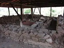 The excavations were carried out in two phases. The first works began in May 1999 and lasted until March 2000. The second phase of excavation began in February 2007 and was completed in November of the same year.[1] Most of the remains of the Tria Platania settlement were destroyed during the construction of the railway tunnel. A farmhouse from the Hellenistic period was discovered; Coins and pottery helped dating the find to the end of the 4th century BC. It is one of the largest ancient farmhouses ever found in Greece. The building had a floor area of approximately 55 m by 42.50 m and extended from east to west. This design was preferred for climatic reasons, as this is the main wind direction.[2] Grapes were cultivated and wine produced. In the northwestern part of the house was an extensive deposit with large clay vessels, the other rooms of the building were smaller.