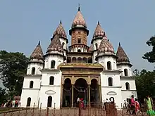 Hangseshwari Temple, in Bansberia, is 21 meters tall and has 13 towers, each shaped as a lotus flower, is a marvellous feat of architecture based on Kundalini and yoga concepts. Inner precincts of the minars follow the design of the human anatomy. Metallic idol of rising Sun God with his thousand bright rays has been inscribed on the top of the central minar. Even the deity has been designed and installed following the concept of Yoga and Pranayam. The Deity is blue in colour and made of wood derived from "Neem" tree.