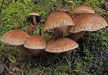 According to the infrageneric classification of Tricholoma proposed by Rolf Singer in 1986,[9] Tricholoma vaccinum is placed in the section Imbricata, subgenus Tricholoma in the genus Tricholoma. Imbricata includes species with a dry cap cuticle, with a texture that ranges from roughened or squamulose (resembling suede) to almost smooth.[10] The specific epithet derives from the Latin word vaccinus and means "pertaining to cows", probably in reference to its color.[11] The mushroom's common names include the "russet scaly tricholoma",[12] "fuzztop",[13] and "scaly knight".[14]