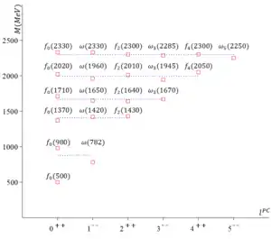 - 1 2 3 Kirchbach, M.; Compean, C. B. (2016). "Modelling duality between bound and resonant meson spectra by means of free quantum motions on the de Sitter space-time ". Eur. Phys. J. A. 52 (7): 210. arXiv:1608.05041. Bibcode:2016EPJA...52..210K. doi:10.1140/epja/i2016-16210-3. S2CID 118370681.