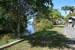 Screened from the road by rows and clumps of leafy trees and shrubs, the Tripcony Hibiscus Caravan Park stands on the busy four-laned Bowman Road opposite the large Stockland shopping complex at the south end of Caloundra. Nestled into the cove at the north end of the Pumicestone Channel, the caravan park has expansive views across to Bribie Island, views southeast to Bulcock Beach and southwest to Golden Beach. The caravan park terminates a strip of high-rise apartments to the east and is separated by a drain from Leach Park to the south.[1]