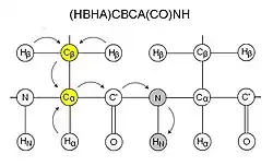 CBCA(CO)NH, or alternatively HN(CO)CACB, correlates the resonances of the amide of a residue with the Cα and Cβ of the preceding residue.[11] Two peaks corresponding to the Cα and Cβ are therefore visible for each residue. This experiment is normally used together with HNCACB. The sidechain carboxamide of glutamines and asparagines also appear in this spectra in this experiment. CBCA(CO)NH is sometimes more precisely called (HBHA)CBCA(CO)NH as it starts with aliphatic protons and ends on an amide proton, and is therefore not an out-and-back experiment like HN(CO)CACB.