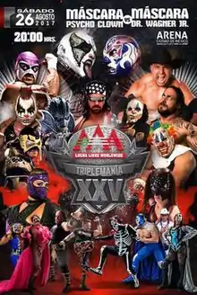 2017 marked the 25th year since 1993 where the Mexican professional wrestling company Lucha Libre AAA Worldwide (AAA) or Triple A held their annual Triplemanía show and the 31st Triplemanía show promoted by AAA, as they held multiple Triplemanía shows over the summers of 1994 to 1997. The 2017 event took place at the Arena Ciudad de México (Mexico City Arena), an indoor arena in Azcapotzalco, Mexico City, Mexico that has a maximum capacity of 22,300 spectators.[1][2] This was the sixth consecutive Triplemanía (XX, XXI, XXII, XXIII and XXIV) held at the venue.[3][4][5] AAA's Triplemanía is their biggest show of the year, the highlight of their year, AAA's equivalent of the WWE's WrestleMania or New Japan Pro-Wrestling's Wrestle Kingdom event.