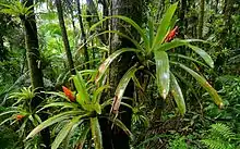 Large trees, such as the pacque, allspice, and breadnut tree, provide habitat for most animal species and other plant species. The leaves are usually oval, thick, and waxy with pointed drip tips to alleviate water collection. Roots are often buttressed (flaring from the above ground), radiated across the forest floor, or stilted as prop roots. Lichens, orchids, and mosses cover the trunks of trees, retaining moisture and hosting small invertebrates. Most tropical trees have large, colorful, fragrant blossoms and plump fruits, perfect feeding for animals and insects.[17] Climbers, hemiepiphytes, and epiphytes are the major groups of non-tree species, although they tend to inhabit trees. Climbers provide a road system in canopies for motile animals.[18] Vines are large in biomass and are an essential food source for many faunas. Hemiepiphytes have the most unusual growth forms and are parasitic to larger trees. Epiphytes claim space on a branch and set roots, trap minimal soil, and photosynthesize. They adhere tightly to the bark of trees but, are not internally parasitic. As rainforests become drier and more disturbed, these native species become rare. The loss of these plant communities severely affects the world, in regard to the increase of carbon dioxide, high floods, and impure water.