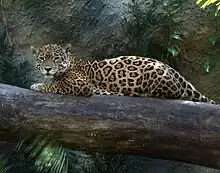 The two main keystone species of the Tropical Wet Forest ecoregion are the American crocodile and the Mexican jaguar. They are both top predators and influence the population of their prey. American crocodiles create habitat for many creatures through their water holes and the paths they create. Their diet consists of fish, snails, birds, frogs, and mammals that come to the water's edge.[19] Males can grow up to 15 feet long and weigh up to 2,000 pounds while females range from 8–13 feet. Their average life span is around 45 years. Females lay a clutch of between 20 and 60 eggs which hatch after an average of 85 days. The mother leaves the young to fend for themselves after a few days.[20] The jaguar is the third largest cat in the world and the largest in North America. It is between 5 and 8 feet, nose to tail, and weighs between 140 and 300 pounds. Their average lifespan in the wild is 12–16 years while in captivity it ranges from 20 to 27 years. They have been observed to prey on around 85 different species, the most common of which are terrestrial mammals, they prefer giant anteaters, capybaras.[21] Females become sexually mature around 2–3 years while males become sexually mature around 3–4 years. They have a gestation period of about 100 days and give birth to an average litter of 2 cubs. The cubs are able to open their eyes after about 8 days and are able to walk 10 days after that. They stay with their mother for a year and a half.[22]