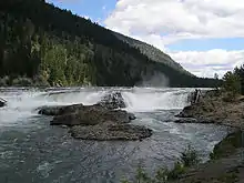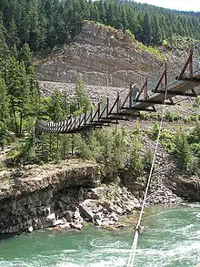 The nearby Kootenai Falls and the Swinging Bridge were featured in the 1994 movie The River Wild.[32] The original bridge was constructed by the Civilian Conservation Corps during the Great Depression, and the falls are a sacred site to the Kutenai tribes who originally lived in the area.[49]