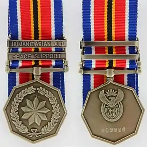Clasps may be awarded to indicate a particular campaign or operation for which the medal has been conferred. The three clasps which have been instituted to date are the Peace Support Clasp, Humanitarian Aid Clasp, and Force Intervention Brigade Clasp.[1][2][6]