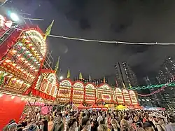 Before 1961, Tsing Yi Bamboo Theatre used to be removed right after 29 April, and then built again on 3 May. However, due to the cost, people combined the two celebrations together and use the theatre for both events with removing. Since 1961, Tsing Yi Bamboo Theatre will be built temporary for two celebrations: the birthday of Tin Hau (The Empress of Heaven) on 15 March in lunar calendar and Zhen Jun (The True Lord) on 23 March in lunar calendar. In other words, the theatre will be available from 29 April to 3 May, after that, it will be removed. There will be people selling Hong Kong local food and snacks such as bubble gums, teppanyaki (fast grilling on hot plate), barbeque food, fried glutinous rice, fried pork and egg hamburger, and people performing Chinese Opera, fireworks, dragon and lion dance, etc.[1][2]