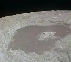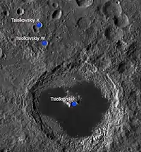 Tsiolkovskiy is a large lunar impact crater that is located on the far side of the Moon. Named for Russian scientist Konstantin Tsiolkovsky,[3] it lies in the southern hemisphere, to the west of the large crater Gagarin, and northwest of Milne. Just to the south is Waterman, with Neujmin to the south-southwest. The crater protrudes into the neighbouring Fermi, an older crater of comparable size that does not have a lava-flooded floor.