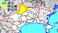 Map of former Tsukui District with Meiji period area in yellow, modern area in green