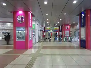 This station has been decorated Cerezo Osaka association football team color, logo and players since 2009 as it is the nearest station to Nagai Park, Nagai Stadium and Nagai Ball Gall Field (Kincho Stadium), the home of Cerezo.[1]