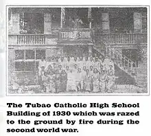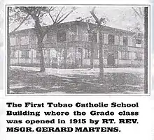 In 1923 the priests acquired the house of Don Urbano Dacanay for P1,000 pesos, west of the plaza, and housed in it the newly founded Tubao Catholic High School. It was renamed the Msgr. Martens Building. This building was destroyed in World War II during the liberation from the Japanese occupation. In January 1951, Father Albert Van Nuffelen sold the lot back for P1,800 pesos to the relatives of the former owner viz., Mr. Bernardino Madriaga and Milagrina Oller who built their house on it.[8]
