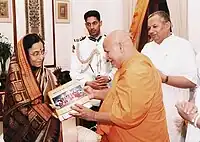 In a report in Times of India, Manjari Mishra and V N Arora accused Rambhadracharya of committing a "blasphemous act of challenging the mighty pen of the Goswami". Nritya Gopal Das, president of Ram Janmabhoomi Nyas, was quoted by Times of India as saying, "How dare he ... he has committed an pardonable [sic] sin and must own it up".[1] A Zee News report accused Rambhadracharya of "changing dohas to chaupais" and vice versa, "changing the wordings of several verses", and "renaming Laṅkākāṇḍa to Yuddhakāṇḍa".[2][5] Zee News reported that a Mantra of page 59 of the edition called Rambhadracharya a Rishi, and quoted that The Akhil Bharatiya Akhara Parishad chairperson Mahant Gyan Das as questioning how Rambhadracharya could be called a Rishi, a term used for the likes of Vamadeva, Jabali and Vasistha.[2] Gyan Das and Nritya Gopal Das also accused the swami of "deleting certain verses and arbitrarily substituting news words".[1] Gyan Das said that as per the meeting of Saints and Dharmacharyas, it was decided that Rambhadracharya should apologise till 8 November, otherwise a decision will be taken to remove Rambhadracharya from the post of Jagadguru in the proposed meeting of the Parishad on 10 November.[3]