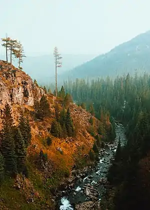 Tumalo Creek is a tributary, about 20 miles (32 km) long,[4] of the Deschutes River, located in Deschutes County in Central Oregon, United States. It rises in the Cascade Range at 44°02′49″N 121°35′55″W / 44.04706°N 121.598647°W, where Middle Fork Tumalo Creek and North Fork Tumalo Creek meet, and forms several waterfalls, including the 97-foot (30 m) Tumalo Falls. Its mouth is on the Deschutes at 44°06′57″N 121°20′22″W / 44.1159506°N 121.3394783°W.[7]