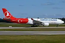 An Airbus A330, of which Turkish Airlines is the largest operator, at now defunct Istanbul Atatürk Airport, with multiple other Turkish Airlines aircraft in the background.